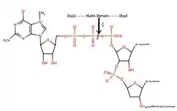 Dcp2 is the protein that actually decaps mRNA, and the rest of proteins in the complex enhance its function and allow it to hydrolyze the chemical bond attaching the mRNA to the 5' cap.[5] The Nudix domain in Dcp2 hydrolyzes one of the bonds on the triphosphate bridge that hooks the mRNA and the 5' cap together, causing the 7-methylguanosine cap to come off and leaving the mRNA open to degradation by the exonucleases in the cell.[4]