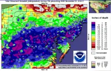 In Philadelphia, snowfall reached more than 2 inches (5.1 cm) per hour, resulting in significant disruption of Interstate 95.[1] By Sunday, December 20, 23.2 inches (59 cm) of snowfall had accumulated in Philadelphia, surpassing the city's second-largest record 21 inches (53 cm) snowfall of February 11–12, 1983 – which itself was surpassed less than two months later by the February 5–6, 2010 North American blizzard. The storm also broke a 100-year-old record for the largest single December storm, previously 20.2 inches (51 cm) on December 25–26, 1909.[14] The storm was reported by meteorologists to share attributes of the 1983 storm.[15]