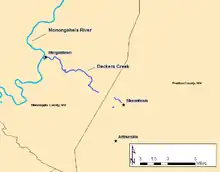 Deckers Creek is a 24.6-mile-long (39.6 km)[1] tributary of the Monongahela River that runs through north-central West Virginia. It begins west of Arthurdale and flows southeast, then north, then northwest towards Morgantown, where it empties into the Monongahela River.[2] The stream has been contaminated by various sources, though largely due to extractive resource mining and improper sewage disposal. Recently, a conservation effort has been launched and conditions are improving, as the area continues to develop for recreational purposes.