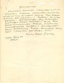 The Armenian Declaration of Independence (Armenian: Հայաստանի Անկախության Հռչակագիր) is the declaration of independence of the Armenian provinces from the Russian Empire. Armenia was proclaimed independent in Tiflis on 28 May 1918.[1][2]