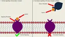 A decoy receptor is a receptor that is able to recognize and bind specific growth factors or cytokines efficiently, but is not structurally able to signal or activate the intended receptor complex. It acts as an inhibitor, binding a ligand and keeping it from binding to its regular receptor. Decoy receptors participate in a common methods of signal inhibition and are also abundant in malignant tissues, making up a significant topic in cancer research.[1]