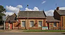 In 1814 a Deddington National School Society was founded to create separate boys' and girls' to succeed the charity school.[2] By 1816 the two schools were teaching 35 children between them, including about 20 from neighbouring parishes.[2] By 1832 the school was housed in converted buildings, including a barn, attached to Appletree Farm in Hopcraft Lane.[2] Support for Deddington's National Schools declined until in 1848 they had only 80 pupils between them.[2] Purpose-built boys' and girls' school buildings were designed by William Hambley of London and completed in 1854 on a new site in Banbury Road.[75] The two schools were an immediate success and pupil numbers recovered to 180 by 1856.[2] But school attendance varied with the seasons, as in the summer farm-workers' children tended to help more on the farm. In 1868, 247 children attended the school in winter but only 191 in summer.[2] Boys and girls remained in separate schools on the same site until 1908, when the girls' school became the infants' school and the boys' school became a mixed school for the older children.[2]
