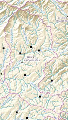 The creek watershed and associated waters is designated by the United States Geological Survey as sub-watershed HUC 031300010203, is named the Deep Creek sub-watershed, and drains an area of approximately 30 square miles northeast of Clarkesville, and east of the Soque River.[3]