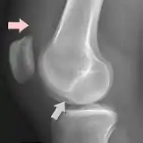In radiology, the deep lateral femoral notch sign is a finding on a lateral radiograph that is considered an indirect sign of a torn anterior cruciate ligament (ACL).[1][2] It is an abnormal deepening of the lateral condylopatellar sulcus from an osteochondral impaction fracture.[1][3] A depth greater than 1.5 mm is a reliable sign of a torn ACL.[1]