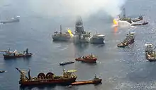 The Deepwater Horizon oil spill (also referred to as the "BP oil spill") was an industrial disaster that began on 20 April 2010, in the Gulf of Mexico on the BP-operated Macondo Prospect,[6][7][8][9] considered to be the largest marine oil spill in the history of the petroleum industry and estimated to be 8 to 31 percent larger in volume than the previous largest, the Ixtoc I oil spill, also in the Gulf of Mexico. The U.S. federal government estimated the total discharge at 4.9 Mbbl (210 million US gal; 780,000 m3).[3] After several failed efforts to contain the flow, the well was declared sealed on 19 September 2010.[10] Reports in early 2012 indicated that the well site was still leaking.[11][12] The Deepwater Horizon oil spill is regarded as one of the largest environmental disasters in American history.