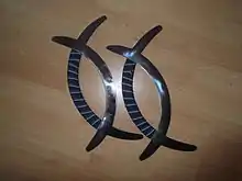 Deer horn knives (Chinese: 鹿角刀; pinyin: Lùjiǎodāo), also known as crescent moon knives or duck blades (Chinese: 鴛鴦鉞; pinyin: Yuānyāngyuè), are specialised Chinese bladed weapons consisting of two steel crescents crossing. They are used in Chinese martial arts. This crossing produces four curved, clawlike points, one of which is extended as the "main" blade. The practitioner grips the wrapped middle of the lengthened crescent with the other acting as a hand guard. They are relatively short weapons that are easily concealable in traditional Chinese clothing, and are usually trained in pairs, one for each hand.