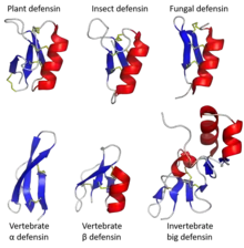 Proteins called 'defensins' are not all evolutionarily related to one another.[7] Instead fall into two broad superfamilies, each of which contains multiple families.[7][8] One superfamily, the trans-defensins, contains the defensins found in humans and other vertebrates[9][10] as well as some invertebrates.[11][12] The other superfamily, cis-defensins, contains the defensins found in invertebrates, plants and fungi.[13][14][15] The superfamilies and families are determined overall tertiary structure and each family usually has a conserved pattern of disulphide bonds.[9][16] All defensins form small and compact folded structures, typically with a high positive charge that are highly stable due to the multiple disulphide bonds. In all families, the underlying genes responsible for defensin production are highly polymorphic.