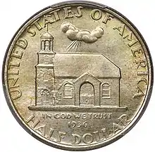 Mint records consider the side with the church as the obverse, though the DSTC considered it to be the side with the ship; numismatic author Q. David Bowers wrote that collectors have come to agree with the Mint,[25] though Anthony Swiatek, in his 2012 volume on commemoratives, note that some collectors and dealers dissent.[26] Consecrated in 1699, Old Swedes Church has been described as the oldest Protestant church building in the United States still used for worship.[27] Swiatek and Walter Breen, in their earlier volume, note that the church is depicted as it appeared, not in 1699, but following the addition of a tower and belfry in 1802. Above the church the Sun is depicted with its rays piercing the clouds; Swiatek and Breen suggested this symbolic of divine protection despite adversity.[28] The year 1936 appears, as required by the authorizing law, and between the year and the church is the motto, IN GOD WE TRUST. Ringing the design are the name of the issuing country, and the coin's denomination.[29]
