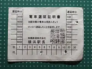 The certificate is issued when delays as little as five minutes occur, and even for instances where the delay is caused by circumstances beyond the railway company's control (e.g. foul weather, person under train). Handwritten certificates or printouts given out (generally in 10 × 15 cm strips) by conductors or station staff can be collected by passengers affected by lateness or delay, who can then produce it to their superiors at school or work and considered as a valid reason for reporting late.[1]