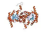 Delta-aminolevulinic acid dehydratase (porphobilinogen synthase, or ALA dehydratase, or aminolevulinate dehydratase) is an enzyme (EC 4.2.1.24) that in humans is encoded by the ALAD gene.[5][6] Porphobilinogen synthase (or ALA dehydratase, or aminolevulinate dehydratase) synthesizes porphobilinogen through the asymmetric condensation of two molecules of aminolevulinic acid. All natural tetrapyrroles, including hemes, chlorophylls and vitamin B12, share porphobilinogen as a common precursor. Porphobilinogen synthase is the prototype morpheein.[7]
