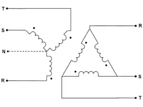 A delta-wye transformer is a type of three-phase electric power transformer design that employs delta-connected windings on its primary and wye/star connected windings on its secondary. A neutral wire can be provided on wye output side. It can be a single three-phase transformer, or built from three independent single-phase units. An equivalent term is delta-star transformer.