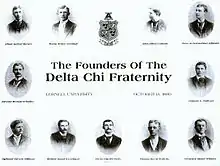 Delta Chi (ΔΧ) is an international Greek letter collegiate social fraternity formed on October 13, 1890, at Cornell University, initially as a professional fraternity for law students. On April 30, 1922, Delta Chi became a general membership social fraternity, eliminating the requirement for men to be studying law, and opening membership to all areas of study. Delta Chi became one of the first international fraternities to abolish "hell week", when it did so on April 22, 1929. Delta Chi is a charter member of the North American Interfraternity Conference (NIC).[2] As of Fall 2019, Delta Chi has initiated over 116,000 members at over 110 Chapters and Colonies, with 34 Alumni Chapters. Its headquarters is in Indianapolis, Indiana.[1]