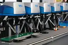 The delta robot is a parallel robot, i.e. it consists of multiple kinematic chains connecting the base with the end-effector. The robot can also be seen as a spatial generalisation of a four-bar linkage.[9]