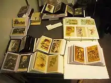 With the index card storage method collections of postcards are located in boxes of the appropriate size. Such boxes can be made by the collector independently from plywood, hardboard and standard shoe boxes. The boundaries of each subsection of the collection are marked with separator cards, which have a format larger than that of the postcard. And when it comes to envelopes, a collector can put different postcards in an envelope dividing them by their themes. The main advantages of these methods compared to albums are its compactness, money saving, and time saving as you do not need to spend time on inserting and rearranging cards in albums; the main disadvantage is that postcards quickly wear out from constant sorting.[20]