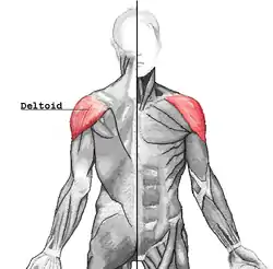 The deltoid muscle is the muscle forming the rounded contour of the human shoulder. It is also known as the 'common shoulder muscle', particularly in other animals such as the domestic cat. Anatomically, the deltoid muscle appears to be made up of three distinct sets of muscle fibers, namely the