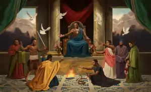 The visual begins with Lipa sitting at a dressing table, applying makeup as a lady whispers to her.[57] It then transitions to a large castle overlooking a red sunset and goes toward the window of a great hall, showing an expensive feast.[57] People wear powdered wigs, Rococo and Baroque petticoats, and ruffled sleeves and collars, with them being seen dancing, drinking, and feeding each other grapes.[57][58] Pop Smoke appears on a medieval tableau,[59] with the painting coming to life.[60] The painting depicts different versions of the late rapper,[46][49] including him as a Roman emperor.[57] He is also seen with white doves flying around him.[46][49] Claire Shaffer for Rolling Stone stated the painting mimics Italian artist Leonardo da Vinci's The Last Supper.[61]