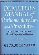 Demeter's Manual of Parliamentary Law and Procedure is a parliamentary authority manual by George Demeter. It is included in the bank of study materials used in preparing for the Certified Parliamentarian (CP) designation offered by the American Institute of Parliamentarians.[1] Similar to Robert's Rules of Order, Demeter's Manual notes, "Without rules, there would be injustice and confusion. Hence, it is as necessary to follow the rules of parliamentary law as it is to follow the rules of a ball game or a card game."[2] The book attempts to include everything a presiding officer might need to know, including public courtesies and ceremonies; sample prayers for opening a meeting; organizing a new lodge, chapter or post; times of fraction and discord; acquisition of new members; installation of officers; and adjournment. Chapter 16 contains an "entire meeting in drill form," designed to illustrate a range of parliamentary motions and situations and how a chairman would handle them. Demeter also devotes space to discussing strategic use of parliamentary procedure. The book concludes with "The Greatest Convention Ever Held", an account of the Creation in parliamentary terms.
