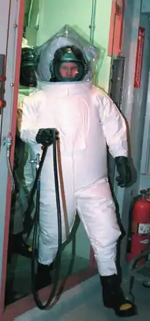 The suit's primary air supply comes through a hose connection to purified air; a self-contained breathing apparatus provides 8 to 10 minutes of escape air in case the primary supply is disrupted. A heart monitor around the wearer's chest checks for signs of distress.[1]