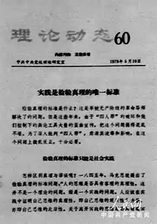 After Mao Zedong's death occurred on September 9 of 1976, with Hua Guofeng as Mao's successor, he felt threatened by the politically domineering Gang of Four. On October 6, under the support of Ye Jianying, Li Xiannian, and other members of the Politburo, Hua Guofeng arrested the Gang of Four. On the following day, Hua was voted in as chairman of the CCP and chairman of the Central Military Committee by a joint meeting of the First Secretaries of the Provincial Party Committees and the Politburo of the Central Committee of the CCP.[3] For proving his legitimacy, Hua instructed Wang Dongxing to let the People's Daily, People's Liberation Army Daily, and Red Flag magazine to publish an editorial now known as the "Two Whatevers". Hua claimed that they would honor Mao's policy and his instruction to the full extent. On the other hand, on July 21, 1977, during the 3rd Plenary Session of the CCP's 10th Central Committee, Deng Xiaoping resumed his positions as Prime Minister of the State Council and Vice-Chairman of the CCP.[3] After Deng came back to work, he started to fix some political decisions of Mao's era. During the spring of 1978, 130,000 victims of the Anti-Rightist Movement who had been removed from their positions in 1957, recovered their social statuses. Deng continued to challenge Hua's legitimacy and fight for the domination in ideological field.[4] For example, Deng wrote an essay on May 24, 1977 titled "The 'Two Whatever' Policy Does Not Accord With Marxism".[5] Under the support of Deng Xiaoping, Hu Yaobang indicated a party journal, Theoretical Trends to publish the article "Pragmatism is the Only Standard in Measuring Truth" on May 10 of 1978, which marked the key difference between Deng and Hua.[6] This article was re-published in Guangming Daily, People's Daily, and People's Liberation Army Daily and soon caused a huge discussion movement in China, which was called The Discussion on Criteria of Truth .