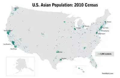 The Asian American population is greatly urbanized, with nearly three-quarters of them living in metropolitan areas with population greater than 2.5 million.[9] The three metropolitan areas with the highest Asian American populations are the Greater Los Angeles Area (1.868 million in 2007), the New York metropolitan area (1.782 million in 2007), and the San Francisco Bay Area (1,577,790 in 2007).[37] New York City proper, according to the United States 2010 Census, is home to more than one million Asian Americans, greater than the combined totals of San Francisco and Los Angeles.[38] This trend of a largely urban population continues to be observed in 2015, with significant populations in more expensive coastal cities, and less than five percent living in rural areas.[39] Among the ten largest US cities, San Diego has the greatest proportion of Asian Americans.[40] As of 2017, West (45%) and California (31%) had the most significant concentrations of the total Asian American populations;[6] this keeps with historic trends of Asian Americans primarily residing in the Western United States, although there is a shift towards other regions of the United States beginning in the late 20th century.[41] According to the 2010 Census almost three quarters of all Asian Americans live in California, New York, Texas, New Jersey, Hawaii, Illinois, Washington, Florida, Virginia, and Pennsylvania.[23] A large proportion of all Asian Americans live in California (5.6 million in 2010),[30][42] New York (1.6 million in 2010),[30] and Texas (1.1 million in 2010).[23] Another state with a significant Asian American population is Massachusetts.[43] Hawaii had the largest proportion of Asian Americans, with 57% of the state population identifying as Asian or multiracial with at least one part Asian.[30] In Vermont in 2008, Asian Americans were the largest minority.[44] Also, two U.S. territories (Guam and the Northern Mariana Islands) have large Asian populations — in 2010, Guam's population was 32.2% Asian, and the population of the Northern Mariana Islands was 49.9% Asian.[45] Asian American populations have grown significantly since the 1970s. However, they are underrepresented in several large urban areas, such as Chicago, Philadelphia, Dallas and Atlanta, although in some cases, Asian Americans are concentrated in specific urban neighborhoods or suburbs of these cities. In regions with large numbers of Asian Americans, communities have developed that are heavily or predominantly Asian. Schools in these areas may offer instruction in languages such as Mandarin. These communities are often given unofficial names to reflect their populations, such as Chinatown, Little Manila, Little India, Japantown, Little Pakistan, Koreatown, Little Saigon, and Little Cambodia. |