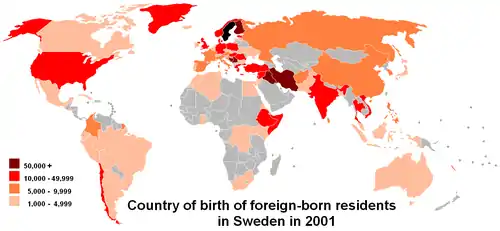 The ten most common countries of birth among immigrants registered in Sweden during 2016 (including asylum seekers who came in 2015) were the following:[60]