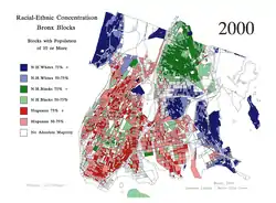 Racial/ethnic concentrations within the Bronx, by block. (Red indicates Hispanic of any race; Blue indicates non-Hispanic White; and Green indicates non-Hispanic Black or African-American.)