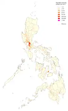 Demography of the Philippines records the human population, including its population density, ethnicity, education level, health, economic status, religious affiliations, and other aspects. The Philippines annualized population growth rate between the years 2015–2020 was 1.63%.[4] According to the 2020 census, the population of the Philippines is 109,035,343.[5] The first census in the Philippines was held in the year 1591 which counted 667,612 people.[6]