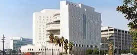 Demolition Man was the first production to film at the Los Angeles Convention Center after it was rebuilt in the 1990s, it was used as the Cocteau Center.[13] "San Angeles" was filmed in Orange County, California. Several locations in Irvine were also used.[13][35][36] The S.A.P.D. police station in the background was the GTE Corporate Headquarters in Westlake Village, California (which later became the Baxter Healthcare building, and was used in the first episode of The Orville). The Pacific Design Center, in West Hollywood was used for the exterior shot of Lenina Huxley's apartment building. The cryo-prison used the exterior of the Metropolitan Detention Center in downtown Los Angeles.[37][38] Filming also took place at Wilshire Courtyard, 5700 and 5750 Wilshire Boulevard.[39] A power station in Eagle Rock, Los Angeles, was used as the underground dwellings of Edgar Friendly and the Scraps.[40]