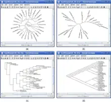 Dendroscope: (a) circular cladogram, (b) radial phylogram, (c) rectangular phylogram, and (d) slanted cladogram. Image by Huson et al.