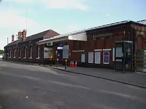The original station layout had four roads: two for non-stop trains, and two with platforms for stopping services. There was a small goods yard north of the line, and a signal box at the London end of the "down" platform. The two through roads have been removed, being taken up in December 1965, with all services using the platform roads and has since had improved track alignments to allow fast running trains. The signal box closed on 15 June 1975. The former goods yard is now the station car park.[2][3]