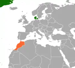 Denmark–Morocco relations refers to the current and historical relations between Denmark and Morocco. Denmark has an embassy in Rabat[1] and Morocco has an embassy in Copenhagen.[2] Denmark also sends aid to Morocco as part of the Danish-Arab Partnership Programme.[3][4] In January 2008, Danish Foreign Minister Per Stig Møller visited Morocco for the opening of the Danish embassy in Rabat.[5] In March 1980, Mohammed VI of Morocco visited Denmark as the Crown Prince of Morocco and Moroccan Foreign Minister Mohamed Benaissa visited Denmark in 2005 and in 2006.[6]