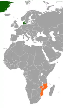 Denmark–Mozambique relations refers to the current and historical relations between Denmark and Mozambique. Denmark has an embassy in Maputo,[1] and Mozambique is represented in Denmark, through its embassy in Stockholm, Sweden with an honorary consulate in Copenhagen.[2] Diplomatic relations were established on 26 June 1975,[3] but relations date back to before Mozambique achieved independence.[4] The Danish Institute for Human Rights has worked with Mozambique since 1997.[5] In 2000, Denmark signed an agreement with Finance Minister Luisa Diogo about implementation of mechanisms.[6]
