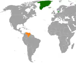 Denmark–Venezuela relations refers to the current and historical relations between Denmark and Venezuela. Denmark is accredited to Venezuela from its embassy in Brasilia, Brazil.[1] Venezuela is accredited to Denmark from its embassy in Oslo, Norway. In 1878, the relations between Denmark and Venezuela were described as "friendly".[2]