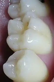 Dental sealants are a preventive treatment that is part of the minimal intervention dentistry approach to dental care.[4] These sealants are a plastic material placed in the pits and fissures (the recesses on the chewing surfaces) of primary (baby) or permanent (adult) molar and premolar teeth at the back of the mouth. These molar teeth are considered the most susceptible teeth to dental caries due to the anatomy of the chewing surfaces of these teeth, which inhibits protection from saliva and fluoride and instead favours plaque accumulation.[5] This approach facilitates prevention and early intervention, in order to prevent or stop the dental caries process before it reaches the ends stage of the disease, which is also known as the "hole" or cavitation of a tooth.[4] Once the tooth is cavitated, it requires a dental restoration in order to repair the damage, which emphasizes the importance of prevention in preserving teeth for a lifetime of chewing.