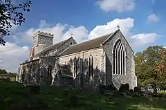 The Church of Denton St Mary is one of 124 existing round-tower churches in Norfolk. Its original round tower fell probably in the 16th century, and was repaired in the most economical fashion, built of brick and square, but retaining the eastern curved part built of flint.[4] In 1696 John Hurrion looked after the parish as an independent minister.[5]