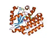 Deoxycytidine kinase (dCK) is an enzyme which is encoded by the DCK gene in humans.[5] dCK predominantly phosphorylates deoxycytidine (dC) and converts dC into deoxycytidine monophosphate. dCK catalyzes one of the initial steps in the nucleoside salvage pathway[6] and has the potential to phosphorylate other preformed nucleosides, specifically deoxyadenosine (dA) and deoxyguanosine (dG), and convert them into their monophosphate forms.[7] There has been recent biomedical research interest in investigating dCK's potential as a therapeutic target for different types of cancer.[6][7][8]