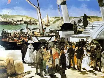 The Folkestone Boat, Boulogne or Departure of the Folkestone Steamer (French - Le Départ du vapeur de Folkestone) is an 1869 painting by Édouard Manet, produced during one of his regular summer stays at Boulogne-sur-Mer. It shows a dawn scene with the steamship which regularly sailed between Boulogne and Folkestone – Manet and his family had embarked on it the previous year en route to London and the woman in white on the far left of the work is Suzanne Manet, accompanied by their son Léon. It is now in the Philadelphia Museum of Art.[1]