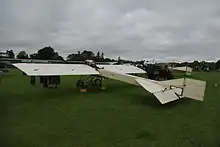 The wings were mounted below the upper longerons and were slightly tapered. Lateral control was by wing warping. In earlier aircraft the warping and bracing wires were attached to a pair of vertical kingposts just aft of the leading edge of the wing: in later aircraft these were braced by diagonal struts leading back to the fuselage longerons. The empennage of early examples consisted of an elongated triangular vertical fin with a cutout to allow elevator travel with a rectangular rudder hinged to the trailing edge, and a similarly elongated triangular tailplane with an elevator.[4] In later examples, such as that in the Shuttleworth Collection, the horizontal tail surface was shorter, the leading edges being swept at about 45°. A distinctive feature of the type was that the trailing edge of the rudder and elevator was braced by wires leading to the control horns.