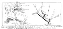 Aircraft controls consisted of a wheel mounted on an inverted U-shaped yoke, the uprights of which were outside the fuselage structure. Fore and aft movement of the entire yoke operated the elevator and the wheel operated the wing warping. The rudder was controlled by pedals. The undercarriage consisted of a pair of trapezoidal frames, each braced by a diagonal member extended forwards to form a short upcurved skid to protect the propeller in the case of nose-overs, with a pair of wheels carried on a sprung cross axle between the two frames.[3]