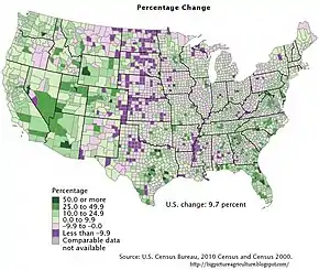 The initial rush to settle the Great Plains by hundreds of thousands of farmers and ranchers has been reversed because of several factors. Perhaps the most significant reasons have been economic. Over the course of the 20th century, farm economies saw dramatic shifts from small-scale family subsistence farming to larger commercial farms utilizing more equipment and less labor.[3] Many family farms proved to be too small to survive. Farmers also used farming techniques which were unsuited to the dry, windy climate and the frequent droughts of the Great Plains. This became manifest during the Dust Bowl years of the 1930s, in which rural flight from the Great Plains accelerated, although the decline in population of some counties had begun as early as 1900.[4] Better roads and the automobile permitted many farmers to live in larger towns and cities rather than on the farm itself. While urban areas on the Great Plains more than doubled in population, thousands of small towns and communities disappeared. Two-thirds of counties lost some part of their population between the early 1900s and the 2010 census, and, as the table below demonstrates, many rural counties lost more than 60 percent of their population. A few counties lost more than 80 percent of their population. Population density of some Great Plains counties dipped below two persons per square mile.[5][6][7]