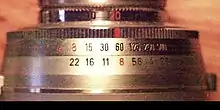 Photographers can use the lens scales to work backwards from the desired depth of field to find the necessary focus distance and aperture.[35] For the 35 mm lens shown, if it were desired for the DOF to extend from 1 m to 2 m, focus would be set so that index mark was centered between the marks for those distances, and the aperture would be set to f/11.[lower-alpha 6]