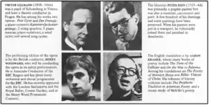 Other performances have been given by Ravinia Festival at Temple Shalom in Chicago (2005), City Opera of Vancouver (2009), Long Beach Opera (2009), Boston Lyric Opera (2011), Dioneo Opera (Grimeborn, London, 2011), and English Touring Opera in London and locations throughout England (2012).[4][13] It was presented in Denver, Colorado, by Central City Opera, in collaboration with other Denver organizations, in January 2013.[14] The New Millennium Orchestra, in collaboration with the City of Chicago's Department of Cultural Affairs, presented the opera in March 2013 on the Pritzker stage of Millennium Park.[15] It was performed in Melbourne at Monash University's Caulfield campus in July 2012 by IOpera,[16] and by Perth Hebrew Congregation, Perth, Western Australia, in June 2014, by Lostandfound Opera[17] Juilliard Opera Center performed the work (in a double bill with Poulenc's Les mamelles de Tirésias) in November 2015.[18][19] The Dutch M31 Foundation made a small documentary with all the old cast members of the first performance and performed the work in 2016 with a new cast in several theatres in the Netherlands.[20] In October 2020, the Atlanta Opera produced socially distanced performances of the work outdoors in a circus tent.[21]