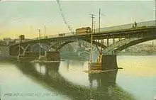 The Derby–Shelton Bridge is a road crossing over the Housatonic River in the U.S. state of Connecticut, connecting the cities of Derby and Shelton. It connects Route 34 in downtown Derby with Route 110 in downtown Shelton. The bridge and approaches are designated but not signed as Route 712. The current bridge (number 01659) was built in 1918 [3] by the Connecticut State Highway Department to replace a former steel-arch bridge built in 1891 known as the Huntington Bridge. Prior to that, an even older wooden covered bridge (built in 1857) was at this site. The Derby–Shelton Bridge used to carry two street railway tracks until the 1930s.