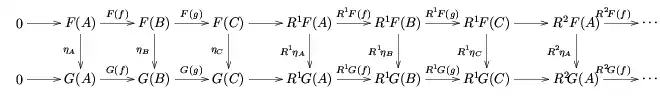 Second, suppose η : F → G is a natural transformation from the left exact functor F to the left exact functor G. Then natural transformations Riη : RiF → RiG are induced, and indeed Ri becomes a functor from the functor category of all left exact functors from A to B to the full functor category of all functors from A to B. Furthermore, this functor is compatible with the long exact sequences in the following sense: if