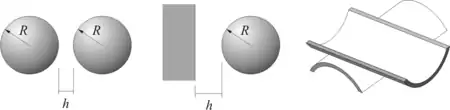 Consider the force F(h) between two identical spheres of radius R as an illustration. The surfaces of the two respective spheres are thought to be sliced into infinitesimal disks of width dr and radius r as shown in the figure. The force is given by the sum of the corresponding swelling pressures between the two disks
