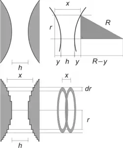 where x is the distance between the disks and dA the area of one of these disks. This distance can be expressed as x=h+2y. By considering the Pythagorean theorem on the grey triangle shown in the figure one has