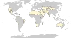 Deserts and xeric shrublands are a biome defined by the World Wide Fund for Nature.[1] Deserts and xeric (ancient Greek xērós, “dry") shrublands form the largest terrestrial biome, covering 19% of Earth's land surface area.[2] Ecoregions in this habitat type vary greatly in the amount of annual rainfall they receive, usually less than 250 millimetres (10 in) annually except in the margins. Generally evaporation exceeds rainfall in these ecoregions. Temperature variability is also diverse in these lands. Many deserts, such as the Sahara, are hot year-round, but others, such as East Asia's Gobi, become quite cold in winter.[1]