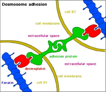 A desmosome (/ˈdɛzməˌsoʊm/;[1][2] "binding body"), also known as a macula adherens (plural: maculae adherentes) (Latin for adhering spot), is a cell structure specialized for cell-to-cell adhesion. A type of junctional complex, they are localized spot-like adhesions randomly arranged on the lateral sides of plasma membranes. Desmosomes are one of the stronger cell-to-cell adhesion types and are found in tissue that experience intense mechanical stress, such as cardiac muscle tissue, bladder tissue, gastrointestinal mucosa, and epithelia.[3]