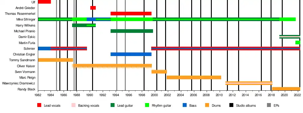 - Mike Sifringer – rhythm guitar (1982–1989, 1990–2021), lead guitar (1982–1987, 1990–1993, 1999–2019), bass (1989–1993)