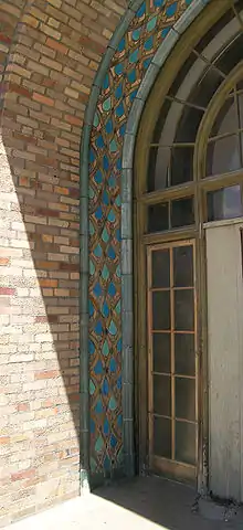 The interior decor was strongly influenced by the then-current Arts and Crafts movement, with hand-wrought ironwork and Pewabic Pottery tilework.[4] The swimming pool was also decorated with Pewabic tile.[3]